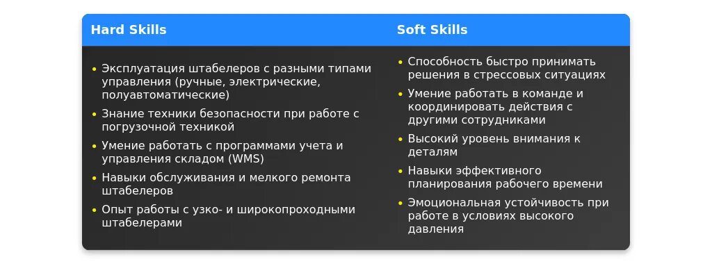 - Hard Skills: Управление штабелером, знание техники безопасности.
