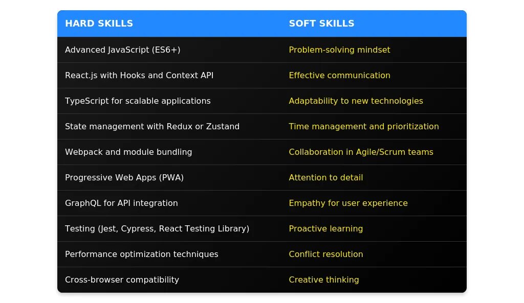 - Ключевые навыки: HTML, CSS, JavaScript, фреймворки (React, Vue).