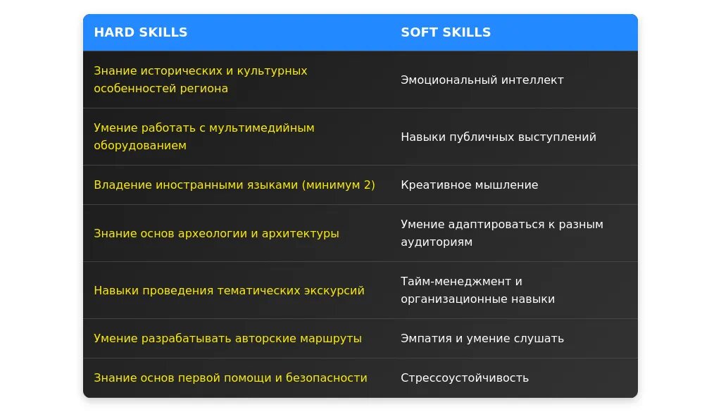 - Акцент на базовых навыках: проведение экскурсий, знание истории.