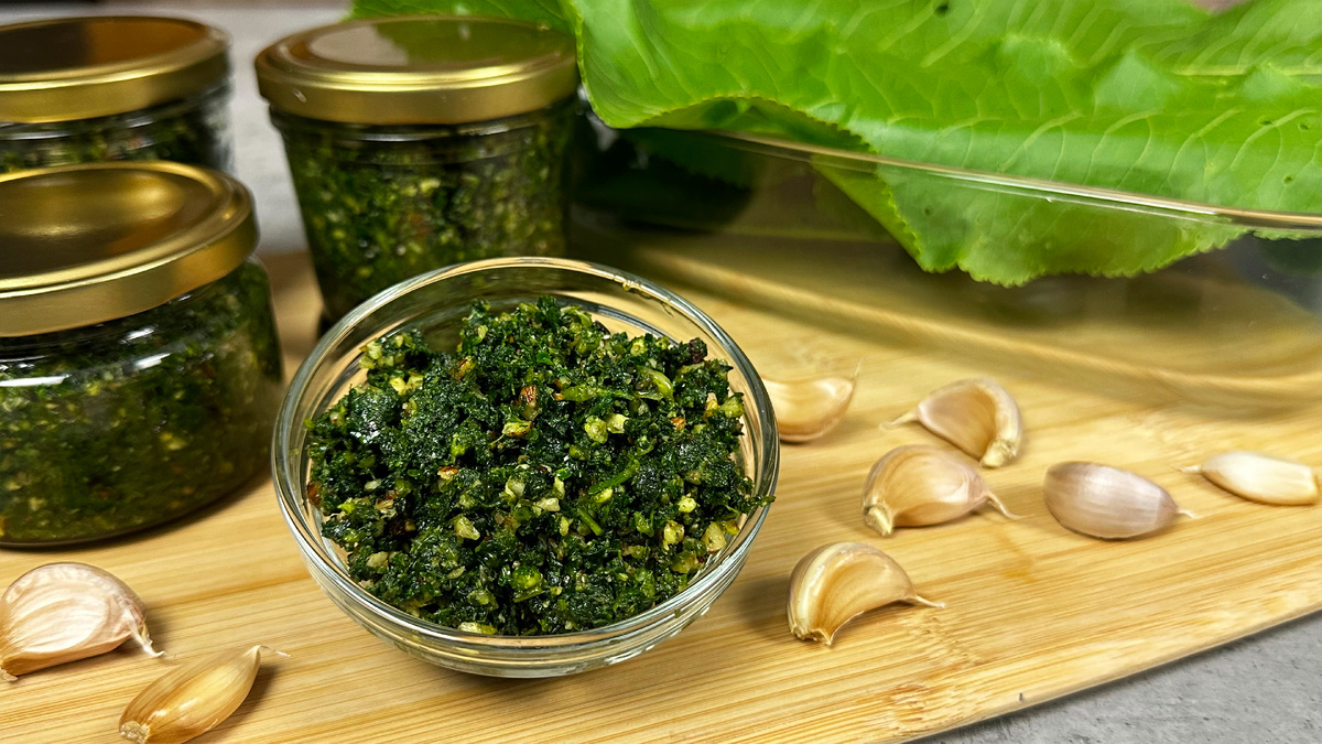 Заготовки на зиму — это всегда творческий процесс, в котором не остается ничего лишнего. Сегодня я хочу поделиться с вами рецептом моей любимой приправы из листьев хрена, которая помогает мне сохранять вкус лета и зимой. И, поверьте, у меня действительно ничего не пропадает! Приправа из листьев хрена — вкус и польза круглый год! Листья хрена я тщательно мою под проточной водой, обсушиваю и обрываю только мягкую часть листа — именно она дает нежный аромат и вкус. А вот стебли я не выбрасываю — из них я делаю другую полезную заготовку, о которой расскажу чуть позже. Для приготовления приправы листья хрена измельчаю с помощью мясорубки. Конечно, можно использовать погружной блендер, но мне нравится, когда в приправе ощущаются небольшие кусочки зелени — так она становится более интересной по текстуре. Далее добавляю 100 грамм чеснока, который также пропускаю через мясорубку. Для свежести и аромата беру 50 грамм петрушки — если любите, можно добавить и кинзу. Особую нотку приправе придают
