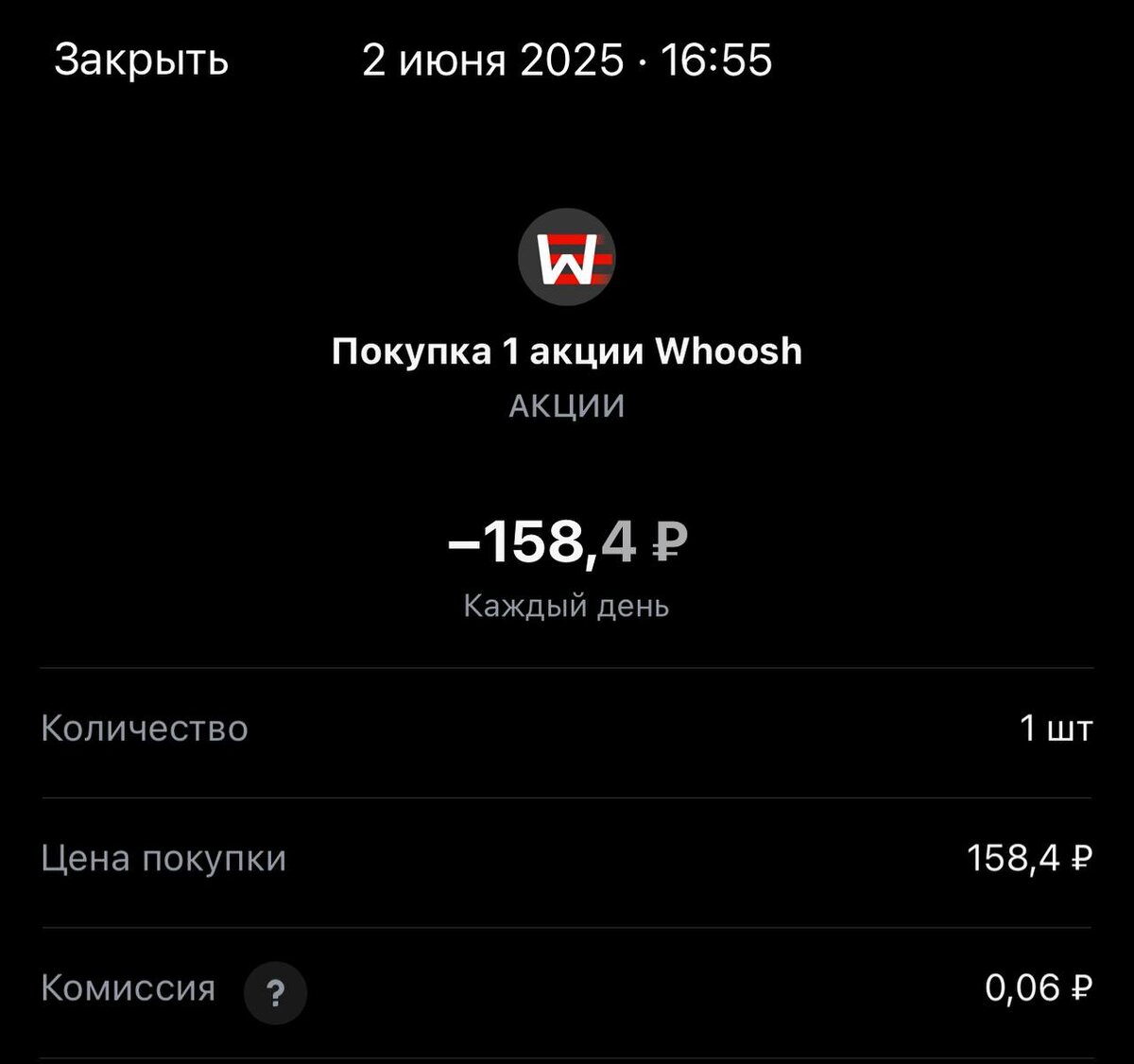 Всем привет! Покупка на сегодня #196, обращаю внимание покупаем один лот. Статистика портфеля на стороннем сервисе, можно посмотреть по "ссылке" Напомню это челендж с коллегами, каждый рабочий день пополняем брокерский счет на 250 рублей и инвестируем. Если возникли вопросы или есть не понимание, что делать. Задавайте «тут» Покупка #196 🟢 «Whoosh» 158.4 rub #WUSH 1 лот #каждыйсможет #челенджсколлегами ✈️ Стас Мироненко 📹Youtube | 📹Rutube