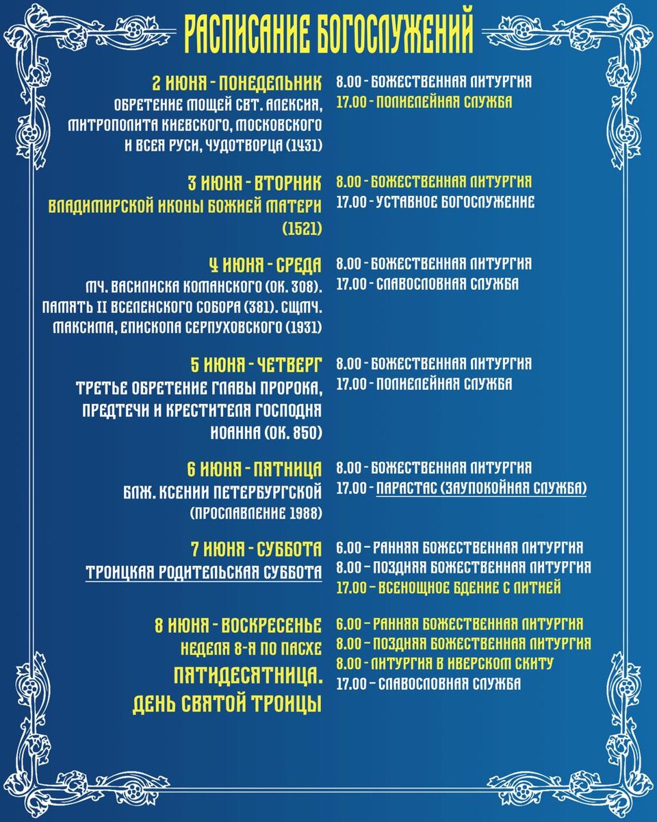 Расписание богослужений 2 июня - 8 июня
