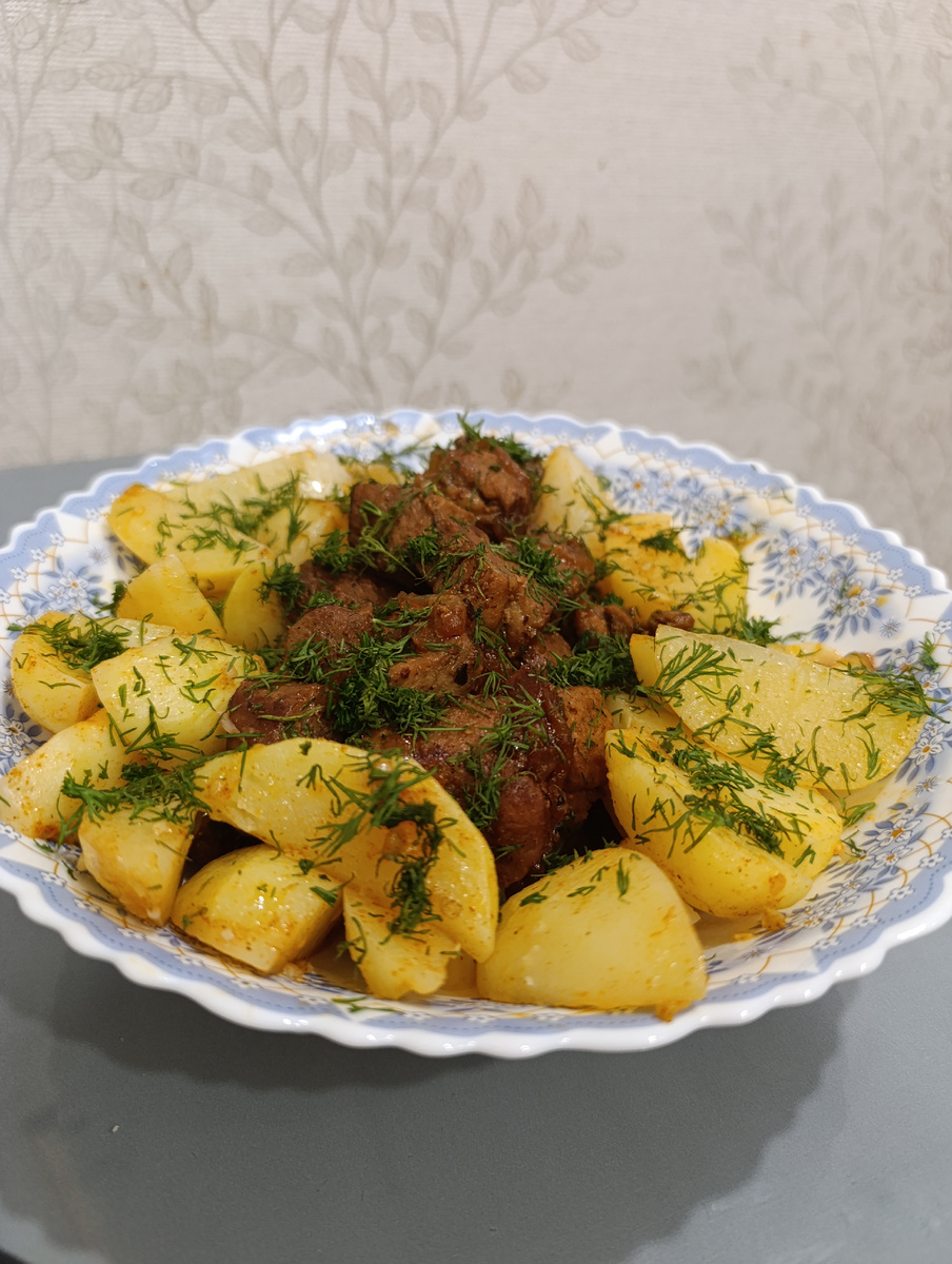 - Пока мясо жарится можно подготовить картошку. Почистить, нарезать на удобные для вас дольки и положить в цалафановый пакет или рукав для запекания. В пакет выдавить чеснок, посолить, добавить паприку и не много масла. И отправить запекаться либо в духовку, либо в микроволновку. Я делаю в микроволновке, 8-14минут и вкусная, мягкая картошка готова. Все зависит от вашей микроволновки. Не забыть сделать в пакетике не большую дырочку, чтобы пакет не лопнул.