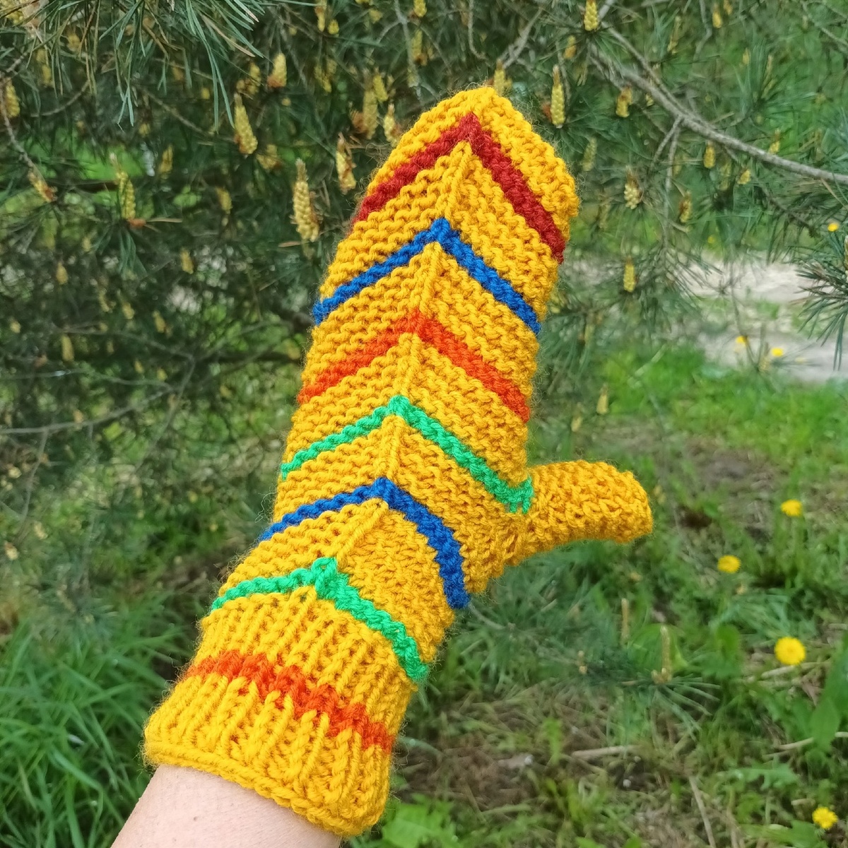 Варежки вяжутся на двух спицах. Пряжа около 170 м/100 г, я исп