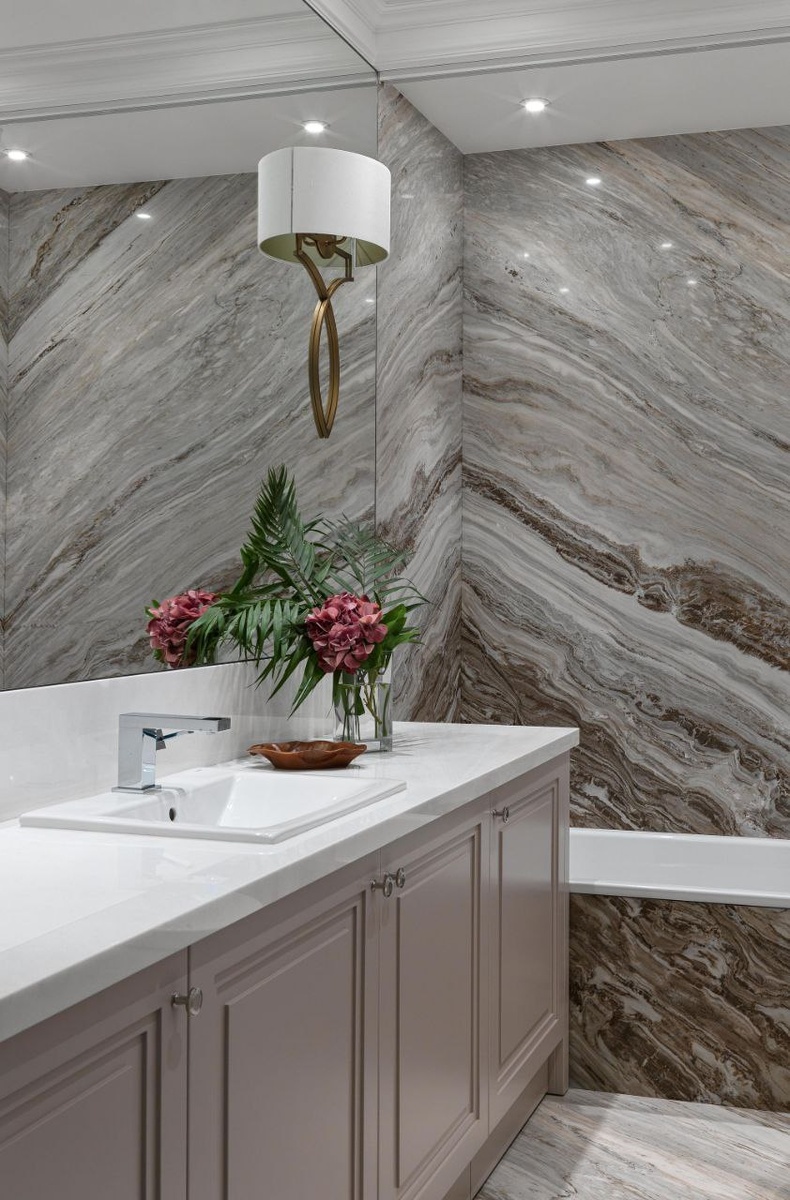 Натуральный камень во влажных зонах: глубина, эстетика, тактильность. В проектах бюро мы работаем в основном с натуральными камнями: мрамором, ониксом и кварцитами. Они не требуют дополнительной обработки и прекрасно проявляют себя в интерьере - даже во влажных зонах. Да, например, есть травертин - он действительно пористый и нуждается в гидрофобной обработке. Но в целом большинство камней отлично чувствуют себя в ванных комнатах, душевых и кухнях, если работать с ними профессионально. Камень живёт веками - римские термы до сих пор с нами, это наглядный пример. И всё же - главное в камне не только практичность. Это уникальный материал - природный ритм прожилок, глубина цвета... Работа с натуральным камнем даёт возможность создавать крупные формы, минимизировать стыки, делать художественные интарсии, "камень в камень". Именно в таких деталях рождается настоящее премиум-качество. Плитка никогда не даст тех ощущений, которые создаёт натуральный камень. Она всегда упрощает. Камень же -
