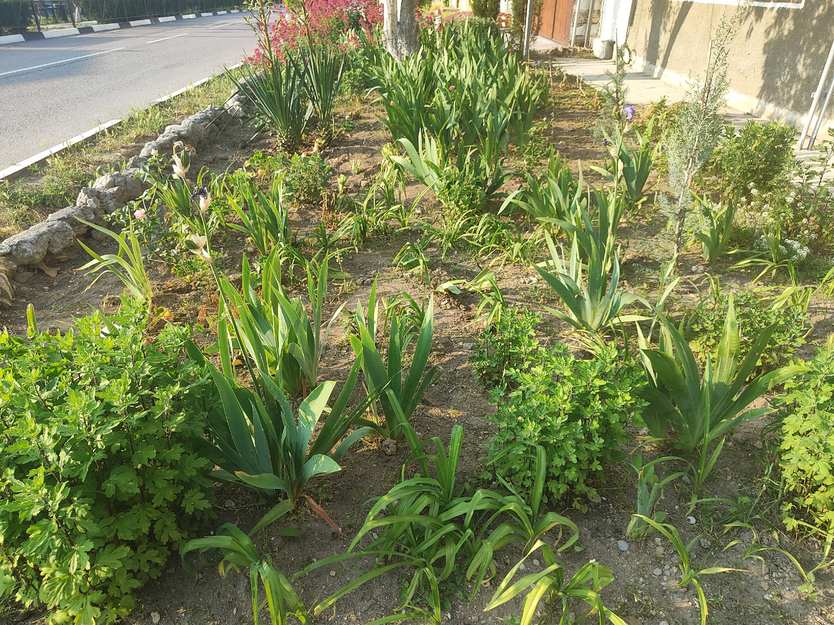 После прополки я высадила ирисы от Людмилы из Ростова. Я их планировала высадить туда, но надо же было прополоть. Если помните я еще юкку подстригла, правда вся обкололась. Короче палисадник принес мне много страданий.) И пока совсем не радует.