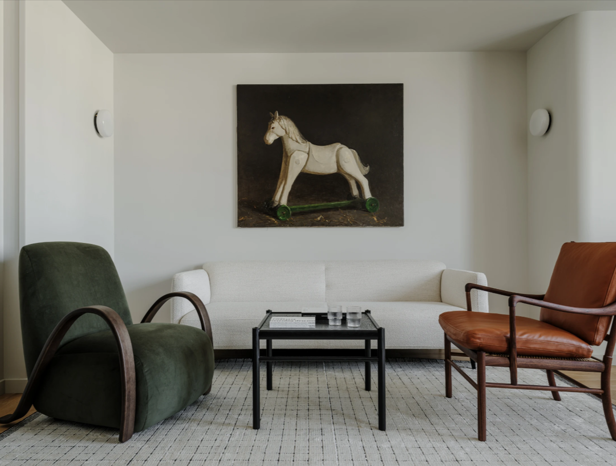 Заказчики серьезно подошли к выбору предметов искусства для квартиры — коллекция формировалась вдумчиво и постепенно. Каждая работа имеет особое значение для хозяев квартиры. В коллекции — уже упомянутая «Лошадка» Егора Дмитриева (другая работа которого с недавних пор находится в коллекции Третьяковской галереи), вышивка Татьяны Чурсиновой с портретами Федерико Феллини и Джульетты Мазина, выполненная по просьбе заказчицы, живописная работа Татьяны Сергеевой, графика Ильдара Гимранова, фотографии Ивана Бойко, портрет виолончелиста в технике рваной бумаги Людмилы Григорьевой-Семятицкой. Интерьер получился тонкий, завораживающий, элегантный. Его хочется рассматривать, в нем хочется пребывать.