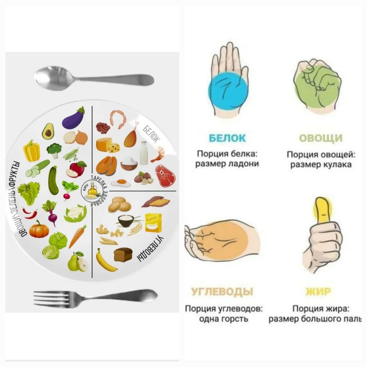 Это еще один метод контроля рациона помимо подсчёта калорий, и его лучше использовать в совокупности с методом ладони (ниже объясню почему). Метод тарелки/ладони подойдёт и "счетоводам", когда нет возможности или неохота считать калории (например на отдыхе). 📕 В чем суть: 1⃣в зависимости от параметров человека и веса, который ему необходимо скинуть, берётся тарелка определённого диаметра При этом основные приёмы пищи выглядят так: ✅1/2 тарелки - овощи/фрукты (с акцентом на овощи) ✅1/4 тарелки - белок ✅1/4 тарелки - сложные углеводы ✅жиры - умеренно. 🧐И тут возникает куча вопросов, так как у всех людей разные пищевые привычки: 🔴кто-то предпочитает лёгкий завтрак или не завтракать вообще (как с ним быть?) 🔴 кто-то не ест фрукты в основные приёмы пищи (как их есть тогда и сколько?) 🔴кому-то необходимы перекусы (как с ними быть?) 🔴а что значит "жиры умеренно"? 🔴а сколько вообще таких тарелок может быть за день? 😱🫣 💡Пояснительная бригада⬇️ для этого (помимо диаметра тарелки1