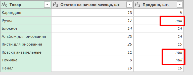 Если вы работаете в Power Query, то наверняка видели такое: NULL - в этой статье разберем, что это такое и увидим, чем он опасен. Несмотря на то, что NULL созвучен со словом "ноль" - это совсем не ноль. NULL - это пустота. Отсутствие значения. Предыдущая картинка как нельзя лучше иллюстрирует различие между 0 и NULL. (тут, как говорится, кто понял, тот понял 😀) Все же работают в Excel и знают функцию ВПР? (ну а как иначе вы оказались на моем канале 😀). Когда функция ВПР не находит искомое значение в таблице-источнике, она выдает ошибку #Н/Д - "Нет данных" Заметьте - не 0, а именно "Нет данных". То же самое происходит и в Power Query. Особенно часто эта ошибка возникает при объединении запросов - аналог функции ВПР в Power Query. Рассмотрим на примере. У нас есть две таблицы: Таблица 1 - остатки на складе на начало месяца Таблица 2 - продажи за месяц Задача - посчитать остатки на конец месяца. Загрузим обе таблицы в Power Query. Для этого встанем на любую ячейку внутри таблицы