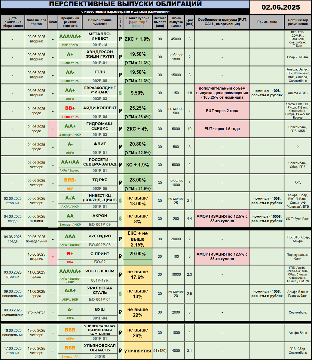 ---------- 🆕 НОВЫЕ РАЗМЕЩЕНИЯ / АНОНСЫ: 🔆 Эмитент ВУШ, он же WHOOSH (🅰️➖) рассказал, что 9 июня состоится сбор заявок на выпуск 001Р-04. Срок обращения составит 3 года, без оферт и амортизаций. Разумеется, за благие условия придется платить купоном - стартовый ориентир ежемесячной выплаты установлен не выше 22%. Собрать компания хочет 2 миллиарда рублей, и вполне может получиться, ибо подобный срок торгов до сих пор в дефиците. Дата начала пока уточняется, организатором выступает Совкомбанк. 🔆 Холдинг ФЛИТ (🅰️➖), преимущественно занимающийся лизингом, представляет свою дебютную версию длинной бумаги. Предварительного сбора нет - заявку, вероятно, можно будет подать в день начала торгов, им станет 4 июня. Трехлетний выпуск 001Р-01 имеет срок обращения 3 года, офертами и амортизациями не утяжелен. Ставка ежемесячного купона уже финально известна - 20,8% годовых. Невероятно сла