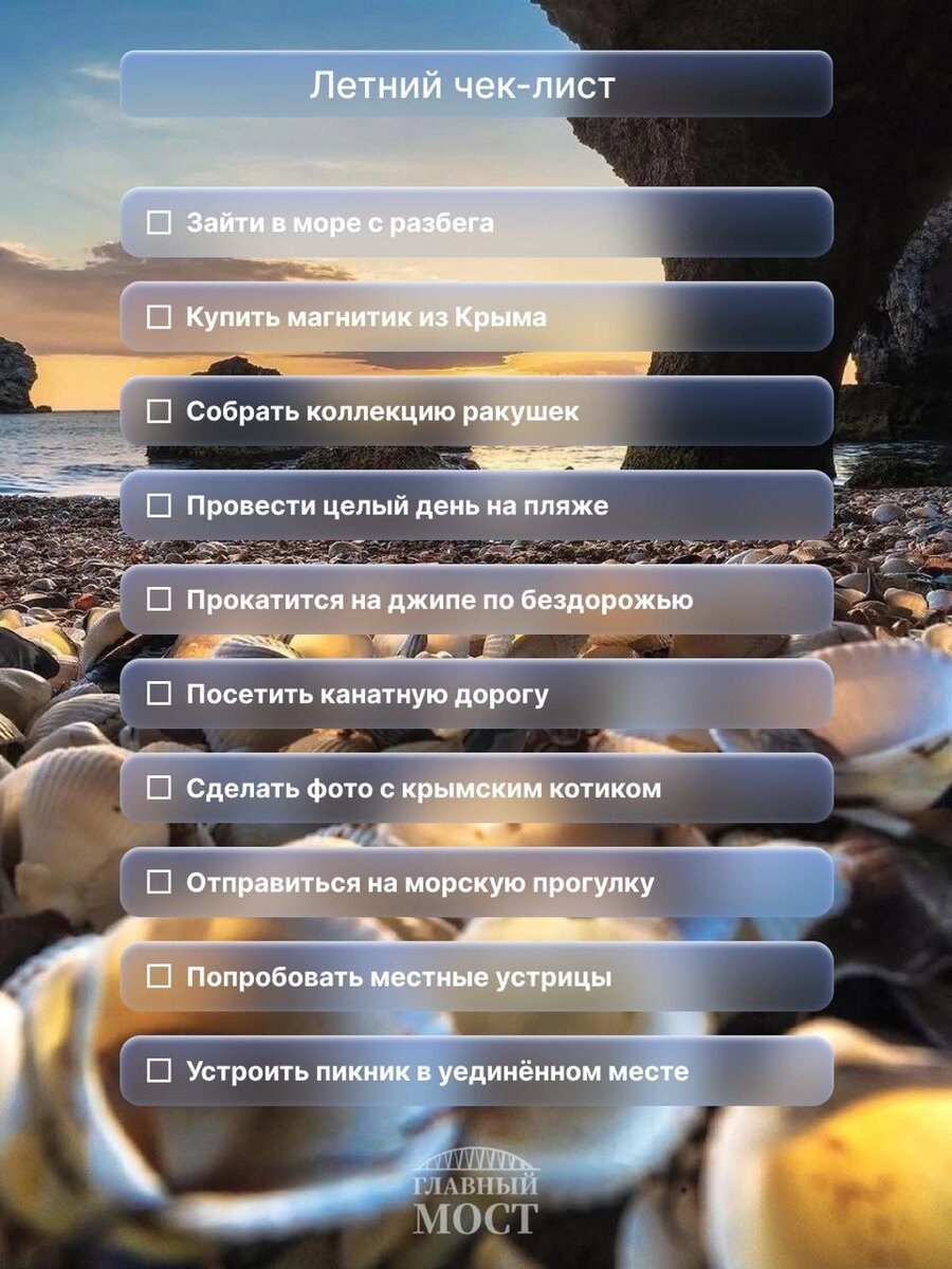 Отдых на все 💯 Собрали для вас новый летний чек-лист! Если идей не хватает — предыдущий вы можете найти здесь 👈 Едем вместе 🚘 Главный мост | Подписаться