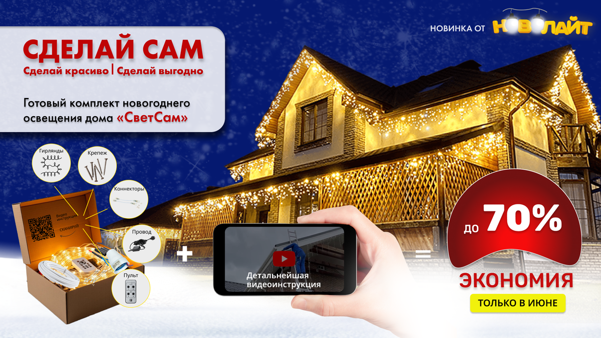 Каждый год в декабре — одна и та же история: "Хотим украсить дом гирляндами, но всё дорого, выбора нет, монтажников не найти." Компания Новолайт, которая 10 лет освещает частные дома, коттеджи и целые посёлки по всей России, решила эту проблему и запустила новинку — готовый комплект новогоднего освещения для дома «СветСам». Это готовый комплект новогоднего освещения, в котором уже есть всё, что нужно для украшения дома: 🎄 Профессиональные гирлянды 🔌 Провода, крепёж, пульт, коннекторы, фотореле 🎥 Видеоинструкция по монтажу — можете смонтировать сами или с любым мастером 📦 Доставка по всей России 🛡️ Гарантия 3 года ✔️ Летняя цена — экономия до 70% ✔️ Спокойствие: к декабрю всё готово ✔️ Никакой суеты, дефицита и переплат ✔️ Сказочная красота 📸 Просто пришлите фото дома — мы подберем нужный комплект под ваш фасад. Смонтируете за вечер — и праздник уже готов! 🔥 Только до конца июня: экономия до 70% Пишите нам в WhatsApp +7 932 536 26 36 и заказывайте комплект «СветСам»