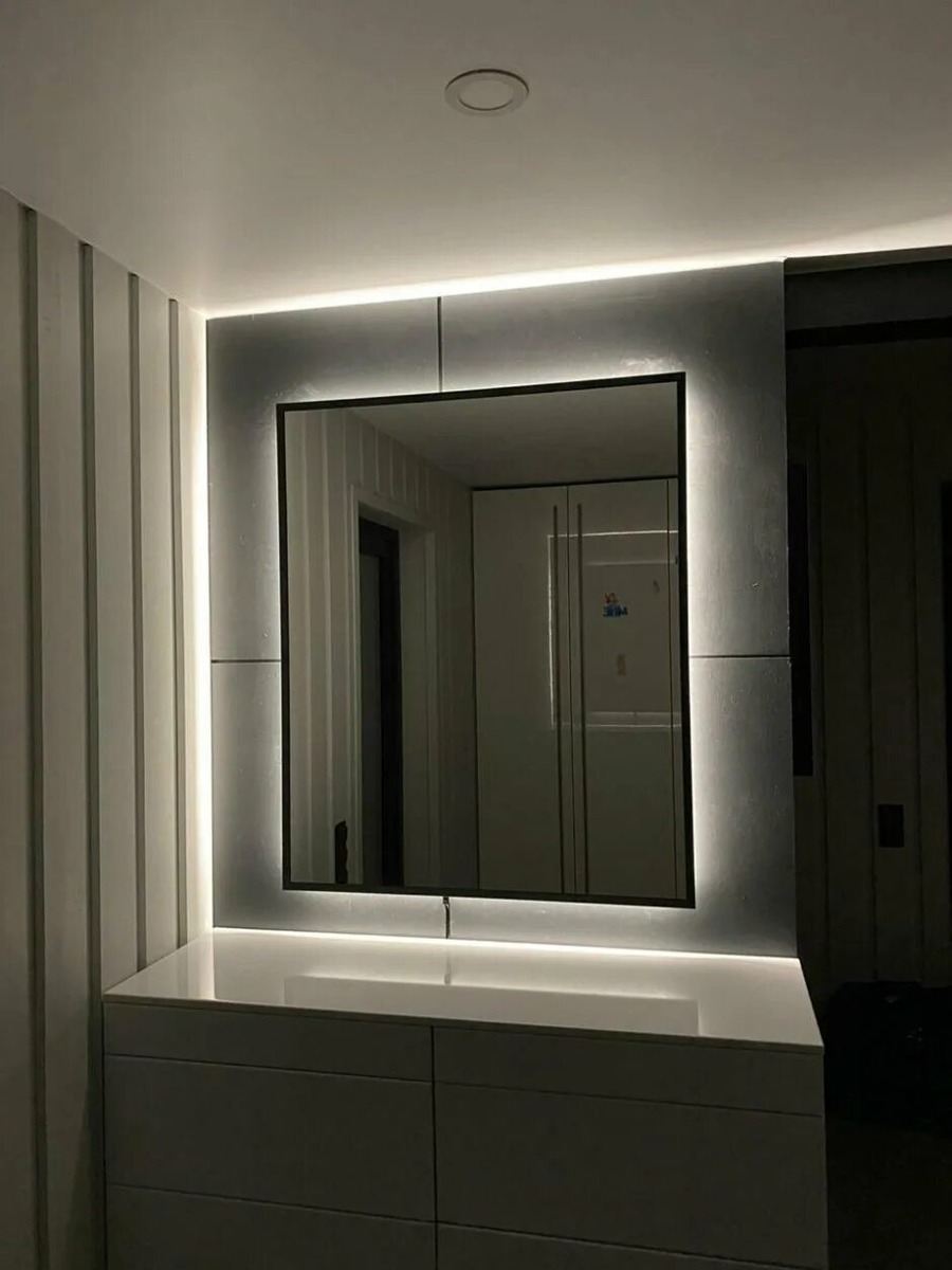 Неон по периметру, свет за зеркалом и мягкая подсветка под раковиной — это не прихоть, а просто удобство плюс атмосфера.