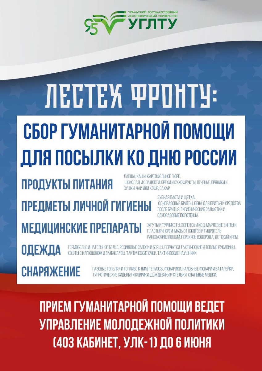 #ЛЕСТЕХФРОНТУ #вузы_фронту Организуем сбор гуманитарной помощи для СВО Категории вещей: ☕Продукты питания: лапша, каши, картофельное пюре, шоколад, сладости, орехи, сухофрукты, печенье, пряники, сушки, чай, кофе, сахар 💧Средства личной гигиены: зубная паста, щётки, одноразовые бритвы, пена и средства после бритья, гигиенические салфетки, одноразовые полотенца медицинские препараты: жгуты, турникеты, зеленка, йод, марлевые бинты, пластыри, кремы от ожогов, гидрогель ранозаживляющий, перекись водорода, детский крем 👕Одежда: термобельё, нательное бельё, резиновые сапоги, берцы, тактические перчатки, тёплые рукавицы, кофты с капюшоном, балаклавы, тактические очки, наушники 🪖Снаряжение: газовые горелки и топливо к ним, термосы, фонари, налобные фонари, батарейки, туристические сиденья, коврики, дождевики, стельки, спальные мешки ВАЖНО: Сбор до 6 июня включительно. Приносить гуманитарную помощь можно в 403 кабинет, ГУК, или в холле 1 этажа складывать в тележку.