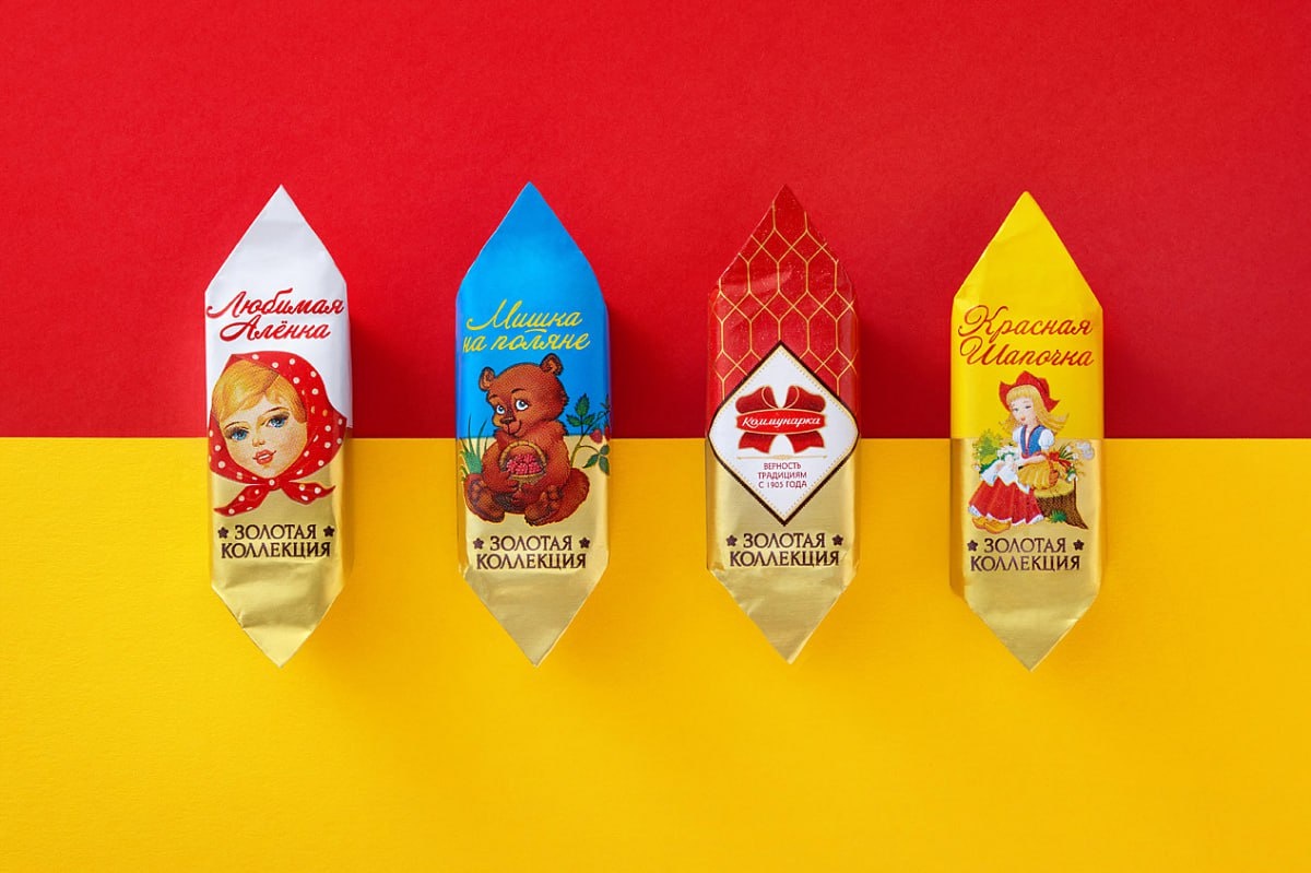 Юбилейная «Коммунарка»: обновленные рецепты и новый дизайн с уважением к классике К юбилею бренда в 2025 году фабрика переосмыслила свои культовые позиции и выпустила линейку любимых конфет с обновленной рецептурой. Задачей агентства Fabula Branding было создать дизайн этикеток, сохранив при этом узнаваемые иллюстрации, с которыми у потребителей связаны теплые воспоминания. Идея дизайна строилась на образе коллекционной ценности и уважения к истории. Упаковку визуально разделили пополам: одна из частей получила лаконичную золотую поверхность, символизирующую статус юбилейной серии. Команда агентства проделала масштабную исследовательскую и креативную работу по поиску и обработке иллюстраций. В архив дизайнеров вошли переработанные с помощью нейросетей версии знакомых образов в разных стилях: «Мишка на поляне», «Аленка», «Красная шапочка», «Коммунарка». Однако в итоге агентство и заказчик приняли ключевое решение — сохранить персонажей максимально узнаваемыми, почти нетронутыми. Как