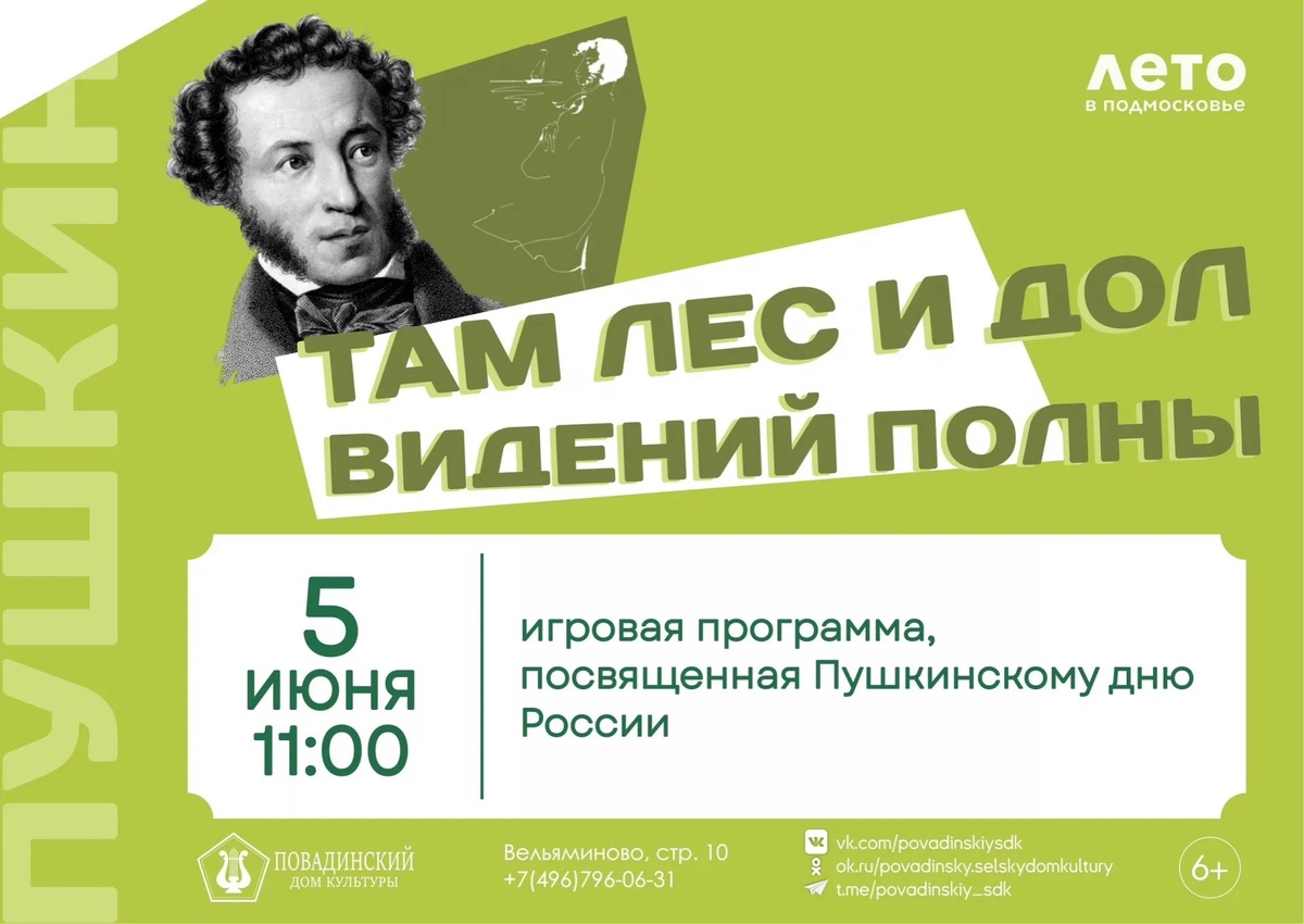 ✨ 🌳Добро пожаловать в Лукоморье🌳 🪶В честь Пушкинского дня России в Повадинском СДК пройдёт игровая программа «Там лес и дол видений полны». Участников мероприятия ждёт встреча с героями произведений Александра Сергеевича, которые поведают им историю жизни и творчества писателя🪶 🚫 Возраст: 6+ 📆 05.06.2025🕒11:00 🏢 Повадинский сельский дом культуры (СДК) 📍 г.о.Домодедово, с.Вельяминово, 10, Центральная площадь ✅ Мероприятия Домодедово https://dzen.ru/id/66f10385cc4c5a16f7b5fb02 http://vk.com/domodedovo_events http://dzen.ru/domodedovo_events