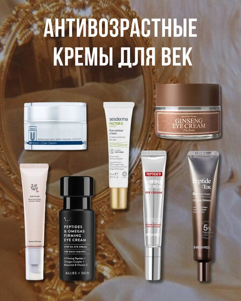 Если вас расстраивают морщинки и потеря упругости в зоне вокруг глаз, выбирайте банки с пептидами, ретиноидами, витамином С, волюфилином. Если вам нужно поработать с отёками в этой области, то активы должны улучшать микроциркуляцию. Это кофеин, ниацинамид, троесерутин, конский каштан, eyeseryl и др. Эти 7 кремов на фото хорошо работают с возрастными изменениями (при регулярном применении, конечно): ❤️ CUSKIN Vitamin U Eye Cream. Средняя по питательности текстура. В составе много пептидов, волюфилин, коллаген, ниацинамид. Для склонной к сухости кожи век с активными мимическии морщинками. ❤️ Beauty of Joseon Revive Eye Serum. Питательный крем для век с ретиналем, который можно использовать и на веки, и на лицо. Тут 2% липосомального ретиналя, вводим в уход постепенно, начиная с 1 раза в неделю. Отлично работает с упругостью кожи вокруг глаз, подтягивает. ❤️ Allies Of Skin Peptides & Omegas Firming Eye Cream. Это мой любимчик, с ним я отчетливо вижу результат: разглаживает мелкие мор