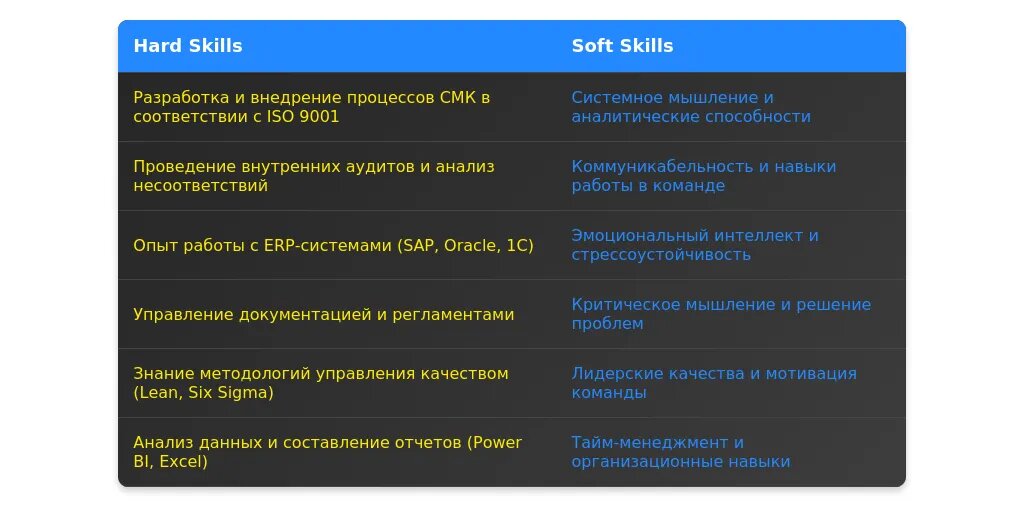 Навыки нужно перегруппировать так, чтобы они соответствовали требованиям вакансии. Выделите ключевые компетенции, которые важны для работодателя. Например, если вакансия требует знание стандартов ISO, укажите это в начале списка.