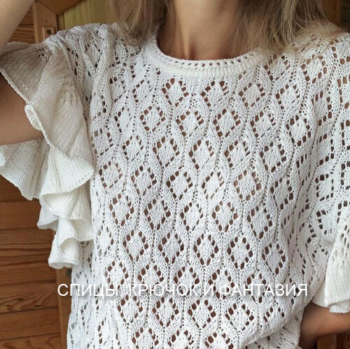 Летний гардероб сложно представить без воздушных и женственных вещей, которые подчеркивают легкость и романтичность образа. Ажурный топ свободного силуэта со спущенным плечом и ажурными рукавами-воланами — как раз такая находка! Его нежная вязка, мягкие складки и игривый фасон создают ощущение невесомости, а спущенная линия плеча добавляет нотку элегантной небрежности. Моя страничка ВКонтакте: https://vk.com/irina_knit_ru Мой канал на Рутубе: https://rutube.ru/channel/23731313/ Мой Телеграм: https://t.me/+l8qqiDZ_4cBlMDE6 Этот топ идеально подойдет для теплых дней, когда хочется выглядеть стильно, но чувствовать себя комфортно. Он легко сочетается с джинсами, юбкой-миди или шортами, делая образ по-настоящему летним и свежим. Чтобы топ получился воздушным, легким и хорошо держал ажурный узор, важно правильно подобрать пряжу. Вот ключевые критерии: Состав пряжи Толщина нити Цвета Материалы: Плотность вязания: 10 см = 22–24 петли (ажурный узор в расправленном виде). Ход работы: Спинк