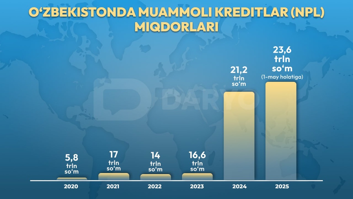 Oylikning yarmi kreditga ketmoqda — Markaziy bank aholi qarz to‘lolmay qolishidan xavotir bildirdi 2024-yilda O‘zbekiston aholisining umumiy qarz yuki, yaʼni oylik daromadiga nisbatan kredit miqdori o‘rtacha 34 foizni tashkil etdi. Bankdan qarz olganlarning ko‘pchiligi oyligining yarmini kredit to‘lashga sarflamoqda. Mazkur toifadagi odamlar qarzlari umumiy kreditlarning 40 foiziga teng. Mamlakatda muammoli kreditlar ulushi ortib borishi jiddiy moliyaviy xatar sifatida ko‘rilmoqda. @daryolive
