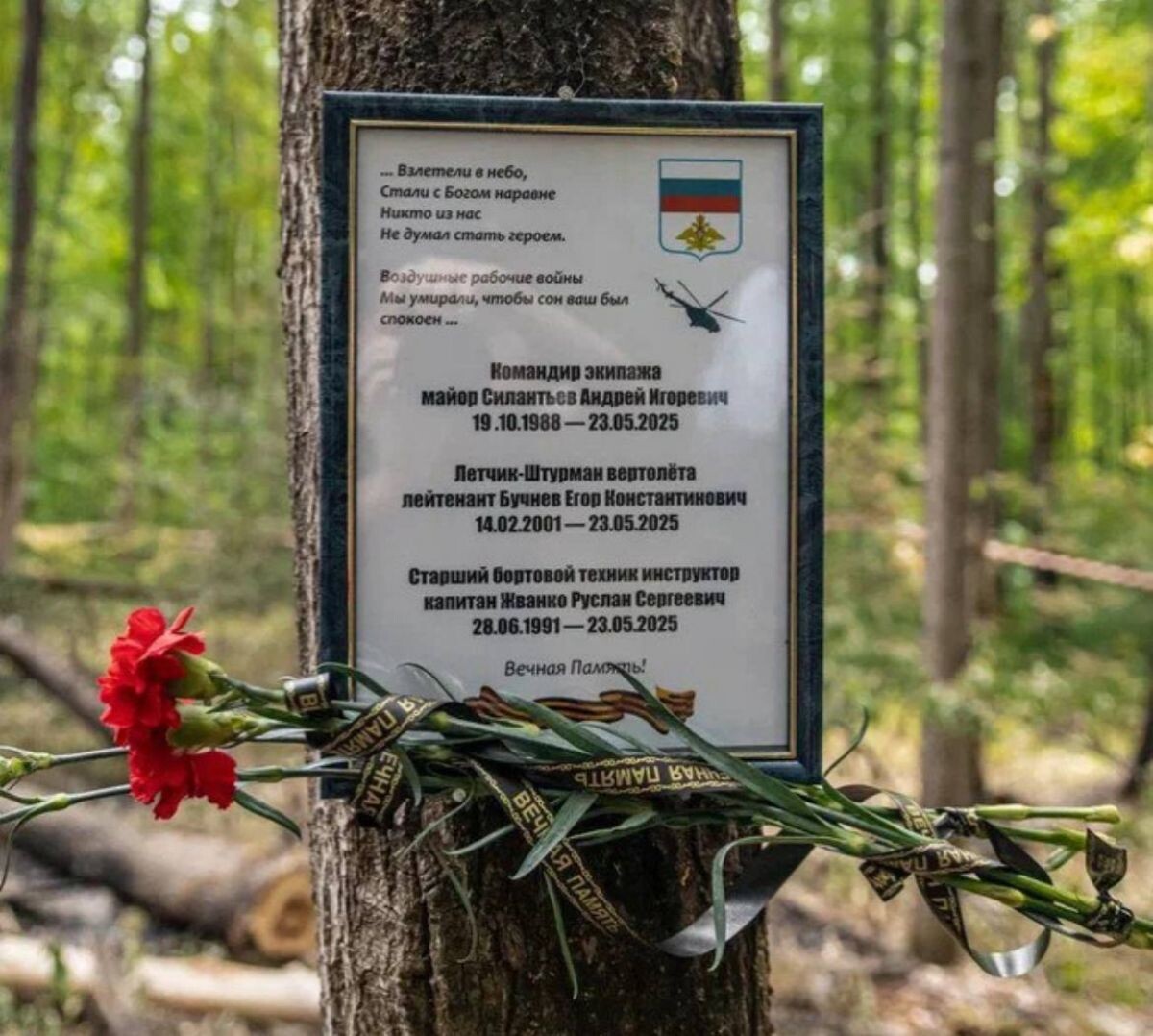 В Нарышкино на месте крушения боевого вертолета Ми-8 появилась табличка в честь погибшего экипажа. Как выяснили «Орловские новости», ее установил певец-патриот из Орла Максим Захаров. Максим Захаров известен своими песнями, посвященными российским военным, участвующим в спецоперации. Свои композиции музыкант исполняет как для гражданских, так и для военных "за ленточкой". В День Победы орловец выступил на главной площади Орла. - Я не хотел это особо афишировать, я узнал о трагедии, созвонились с друзьями и сразу же решили, нужно почтить память погибших летчиков, которые ценой своей жизни не допустили большой катастрофы и увели вертолет от населенного пункта! Узнал имена погибших ребят, сделали табличку, купили гвоздики, лампадки со свечами и приехали на место! По нашей русской традиции просто тихо помолчали и помянули героев, тут нет ничего такого! А вот летчиков будут помнить всегда, Вечная память нашим героям! А родственникам примите слова соболезнования, - рассказал Максим Захаров к