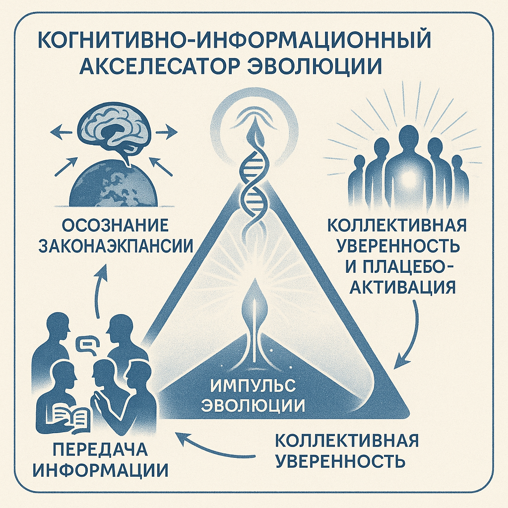 Существует универсальный биоприродный механизм — когнитивно-информационный акселератор эволюции, — активируемый при выполнении трех когнитивно-поведенческих условий. Этот механизм позволяет виду обретать эволюционные преимущества (в том числе ускоренную адаптацию, устойчивость и расширение среды обитания) за счёт интеграции сознательного понимания целей эволюции, передачи информации об этих целях и формирования коллективной уверенности в правильности действий. Гипотеза предполагает существование надбиологического механизма ускорения эволюции, возникающего на пересечении биологии, психологии и информационной теории. Этот механизм может активироваться только при условии когнитивной зрелости вида, его способности к метаосмыслению эволюции, воспроизводству ключевых мемов и созданию устойчивого поля коллективной уверенности в своих действиях. Такое состояние можно рассматривать как фазовый переход в развитии вида — от инстинктивной эволюции к осознанной.