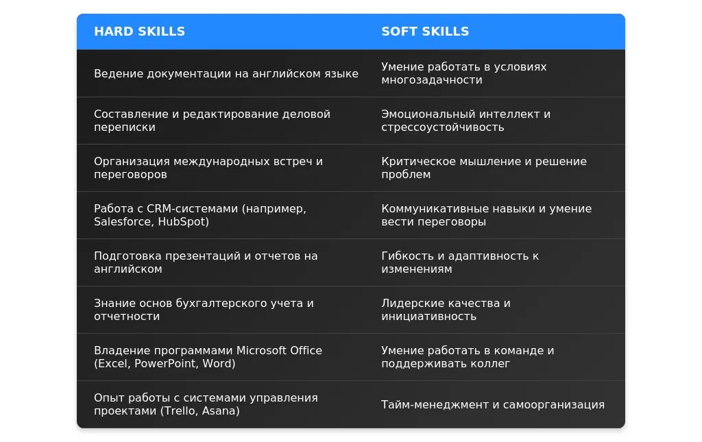 На что делать акцент: организованность, знание английского, навыки работы с документами, готовность к multitasking.
