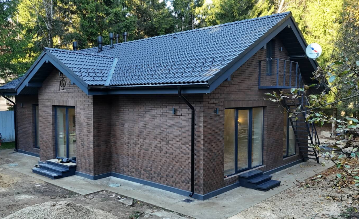 Дом облицован благородным клинкерным кирпичом ЛСР Брюгге — идеально сочетается с природой и лаконичной формой дома.