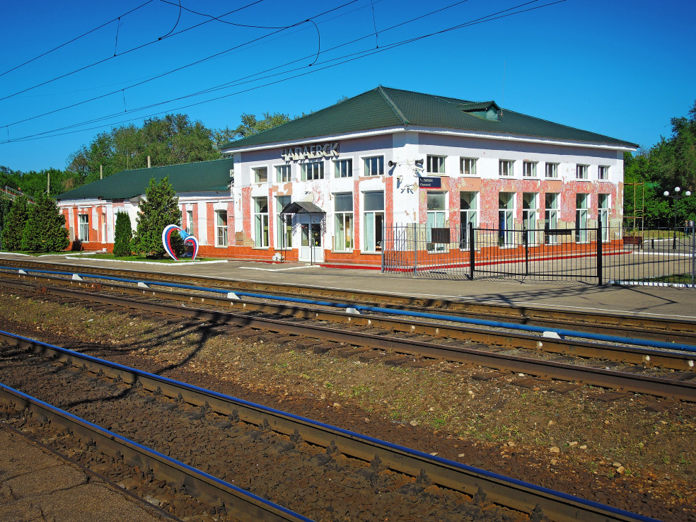 Моя серия коротких однодневных поездок по Самарской области продолжается. В конце мая разведал новый для меня маршрут. Съездил в Чапаевск. Это небольшой город, расположенный недалеко от Самары в южном направлении. По численности населения занимает пятое место среди городов области. Но жителей насчитывается всего порядка 70 тысяч. Город находится на железнодорожной линии, доехать сюда можно на электричке. Время в пути - около часа, в зависимости от станции посадки чуть больше или чуть меньше. С железнодорожного вокзала «Чапаевск» и начну нашу прогулку. Краткую историю города я приводил в обзоре его презентации, которая проходила в рамках региональной выставки «Самара» в конце 2024 года. Повторяться не буду, ссылку можно найти в конце статьи. Посёлок, из которого в последствии вырос город Чапаевск, появился ещё до революции. Открытие железнодорожной станции на его территории состоялось в 1911 году. В исторической справке на сайте РЖД говорится, что современное здание вокзала - это тот са