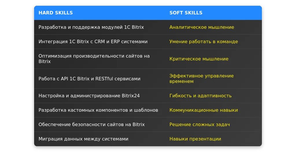 - Список ключевых актуальных навыков для программиста 1C Bitrix;