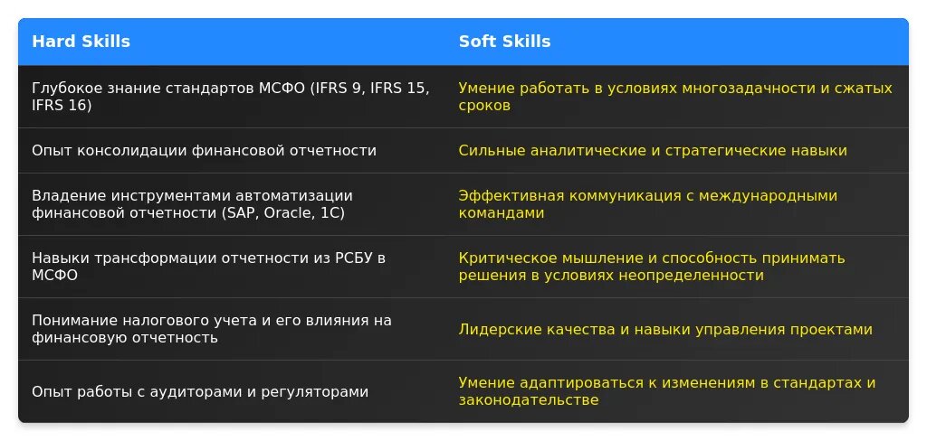 Личные качества (soft skills) играют важную роль в успешной работе старшего специалиста МСФО. Они помогают эффективно взаимодействовать с коллегами и решать сложные задачи.