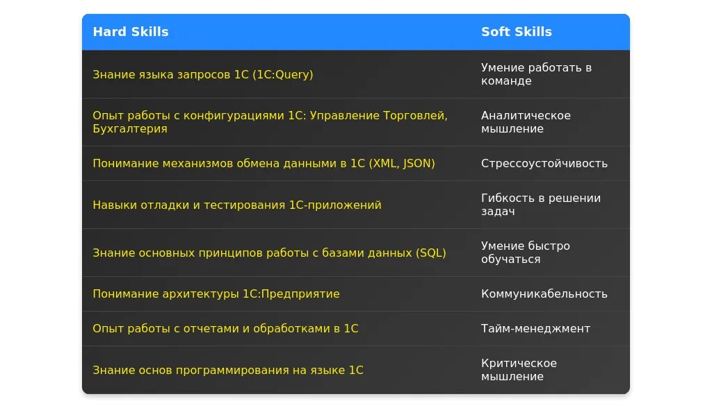 - Перечень актуальных навыков для начинающего 1С разработчика;