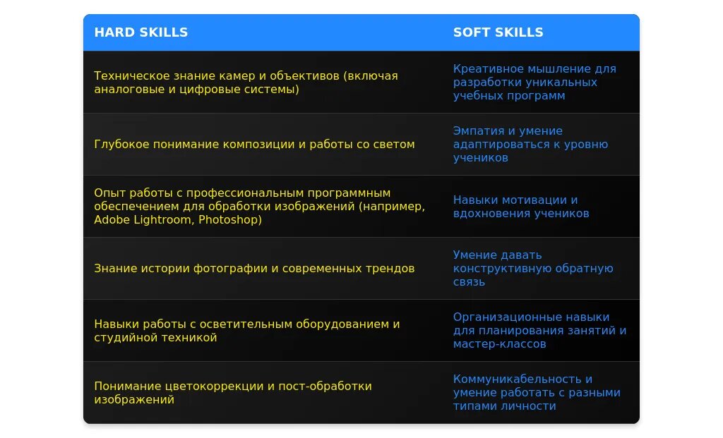 ✅ Пример 2: Ключевые навыки: проведение мастер-классов, разработка учебных программ, работа с профессиональным оборудованием.