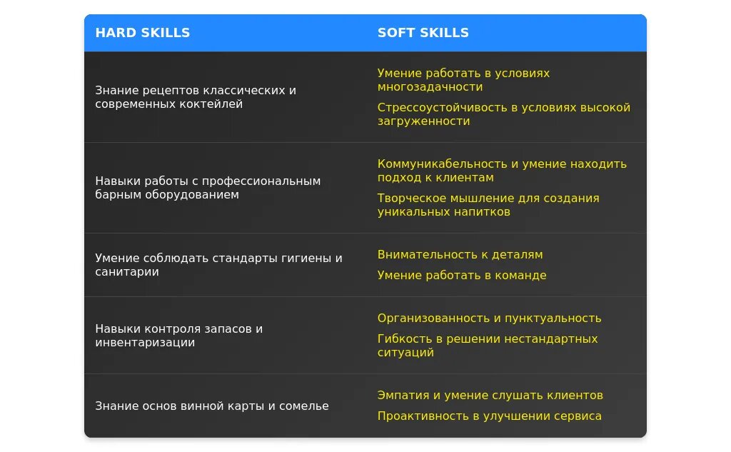 После: "Знание основ миксологии, работа с кассой, обслуживание клиентов, стрессоустойчивость, умение работать в команде."