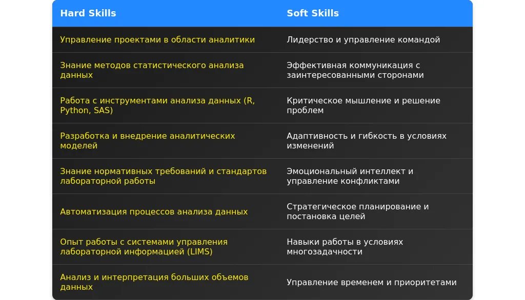 При анализе вакансии для начальника аналитической лаборатории важно выделить ключевые требования, которые разделяются на обязательные и желательные. Обязательные требования чаще всего включают наличие высшего образования в области химии, биологии или смежных наук, опыт управления лабораторией от 3 лет, знание нормативных документов (ГОСТ, ISO) и опыт работы с аналитическим оборудованием. Желательные требования могут включать навыки автоматизации процессов, знание иностранного языка или опыт внедрения систем менеджмента качества.