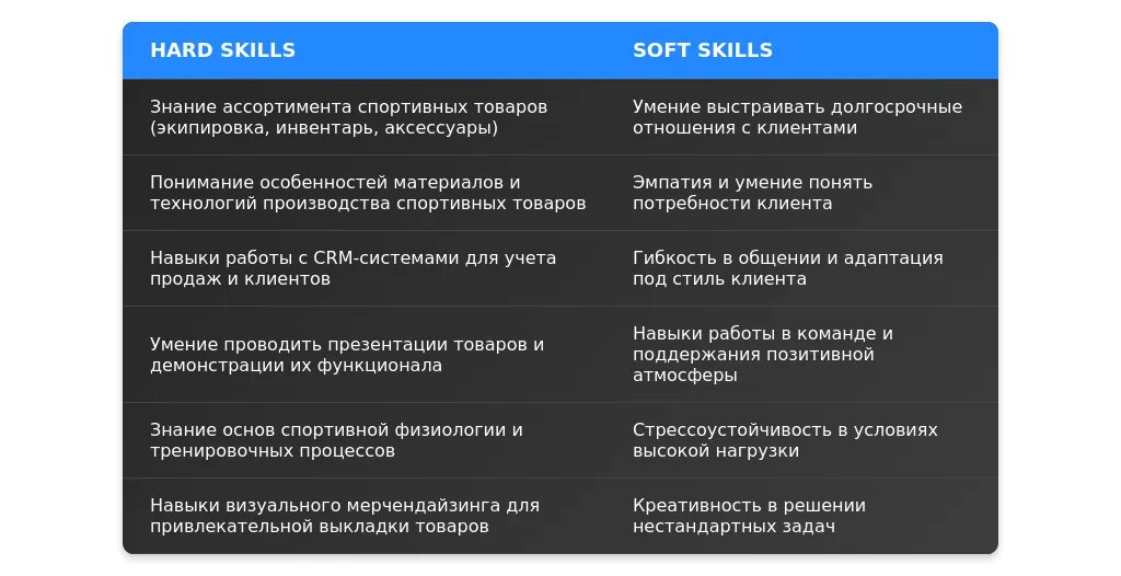 - Ключевые навыки, связанные с продажами и знанием спортивных товаров.