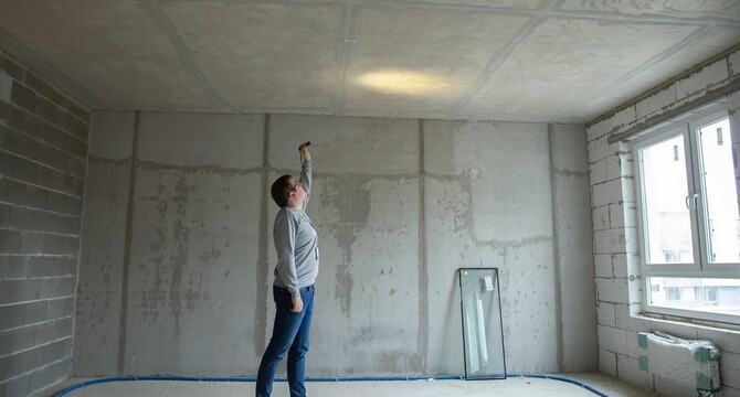 - Что делать, если с потолка отваливаются куски штукатурки?Отбить те что плохо держатся, чтобы позже они не упали на натяжной потолок изнутри.