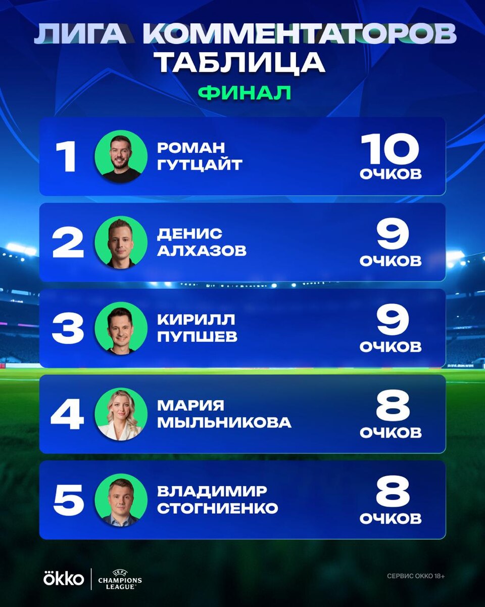 Роман Гутцайт – победитель Лиги комментаторов! 👏 Второе место поделили Денис Алхазов и Кирилл Пупшев. Мария Мыльникова и Владимир Стогниенко забрали бронзу. Лови финальную таблицу. Вернемся с прогнозами в следующем сезоне 🏆