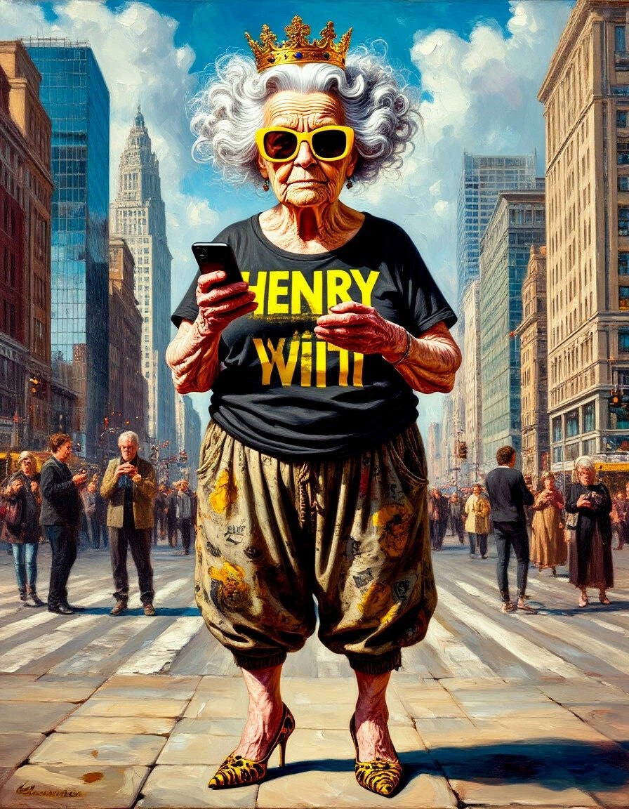 FULL-FIGURE IMAGE, STANDING POSE, glossy oil painting of a medieval elderly single female figure with wrinkles, white curly hair with golden crown, wearing yellow sunglasses, grungy outfit of baggy pants and black t-shirt with the yellow text written on it: "HENRY VIII" with stilettos, watching the screen of a smartphones and standing gracefully against a multi-exposure photography of a modern busy metropolis at daytime