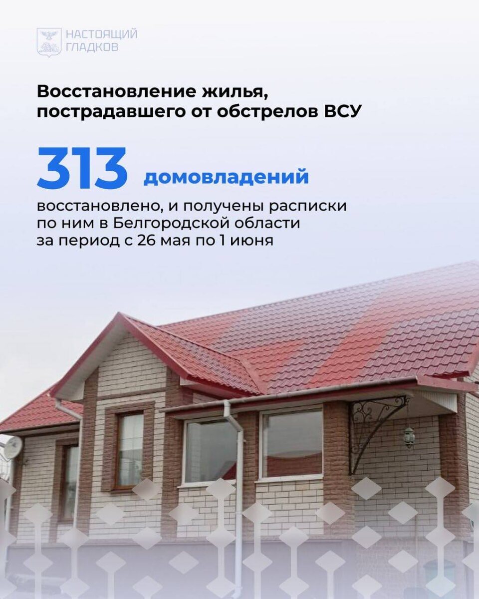 Продолжается восстановление жилья, повреждённого в результате от обстрелов ВСУ в Белгородской области За прошедшую неделю работы были выполнены на 382 объектах. С 26 мая по 1 июня в Шебекинском округе было восстановлено 230 объектов.