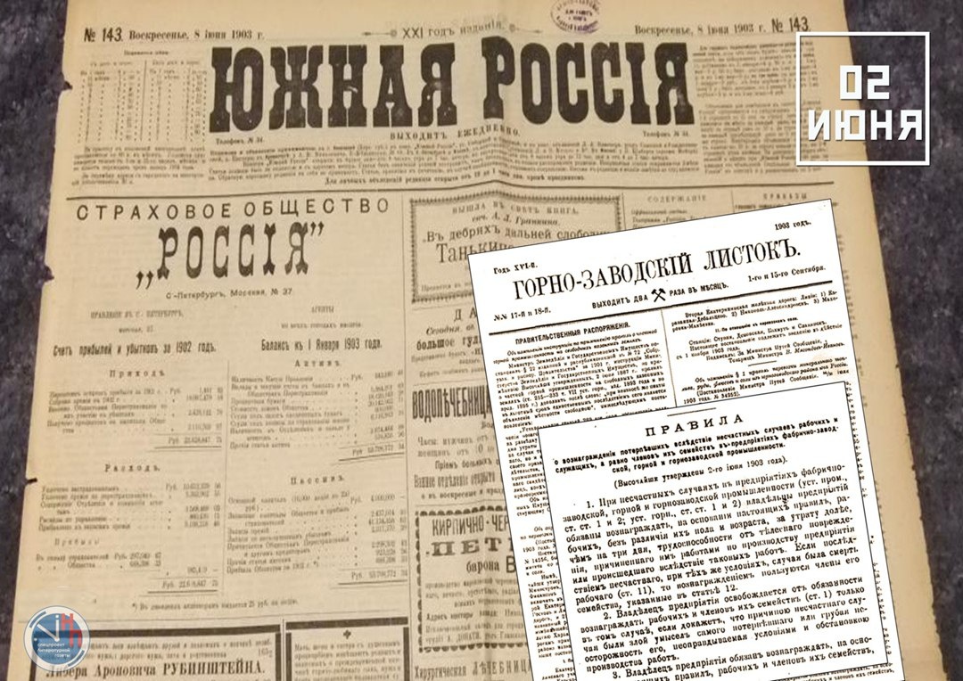 2 июня 1903 г. с высочайшего соизволения императора Николая II в Российской империи были введены «Правила о вознаграждении потерпевших вследствие несчастных случаев рабочих и служащих, а равно членов их семейств в предприятиях фабрично-заводской, горной и горнозаводской промышленности». Этот день считается официальной датой рождения государственного социального страхования в России. В1903 году были приняты первые законодательные Правила о социальной поддержке рабочих и служащих фабрично-заводской и горнозаводской промышленности, пострадавших от несчастного случая на производстве. «Правила о вознаграждении потерпевших вследствие несчастных случаев...» были одним из наиболее существенных законодательных актов, регулирующих отношения рабочих и предпринимателей. Впервые было установлено право российских рабочих требовать хотя бы какую-то компенсацию в случае травмы, полученной на производстве. Этот день считается официальной датой рождения государственного социального страхования в России.
