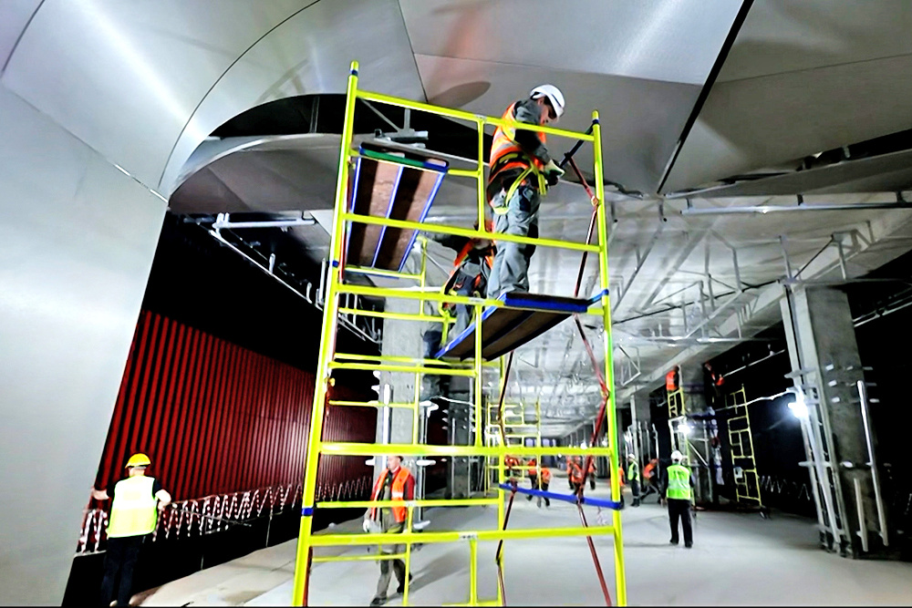 На пересечении проспекта маршала Жукова и улицы Демьяна Бедного работы идут в стесненных условиях. Строительство новой станции "Народное Ополчение" будущей Рублево-Архангельской линии метро выполнено больше чем на половину. "Станция мелкого заложения, глубина заложения 22 метра, станция имеет два подземных вестибюля. На сегодняшний день у нас идет завершение монолитной работы. Остались работы по второму вестибюлю входной группы. Приступили к отделочным работам и инженерным работам", - сообщил Дмитрий Дорожко, руководитель строительства. Вдоль платформы будущей станции расположатся два ряда освещенных колонн, переходящих в своды просторного зала. А в цветовой палитре будут преобладать серые и красные цвета. "Главной фишкой отделки этой станции будут являться стены, на которых будут присутствовать геометрический разброс по тонам. Когда вы идете в одну сторону, то на одной путевой стене вы увидите черный цвет, а на второй путевой стене вы видите красный цвет", - рассказал Сергей Кидяев, г