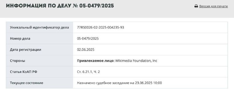В суд Таганского района города Москвы был направлен протокол о возбуждении административного дела по статье "Пропаганда педофилии". Эта новость стала известна благодаря базе данных суда, где была зарегистрирована данная информация. Инцидент произошел 2 июня, как указано в документе. Однако стоит отметить, что данный случай касается не самого фонда Wikimedia Foundation Inc., а другого юридического лица, которое также связано с распространением информации. Этот факт вызвал широкий общественный резонанс и привел к обсуждению проблемы защиты детей от вредной информации на просторах интернета.