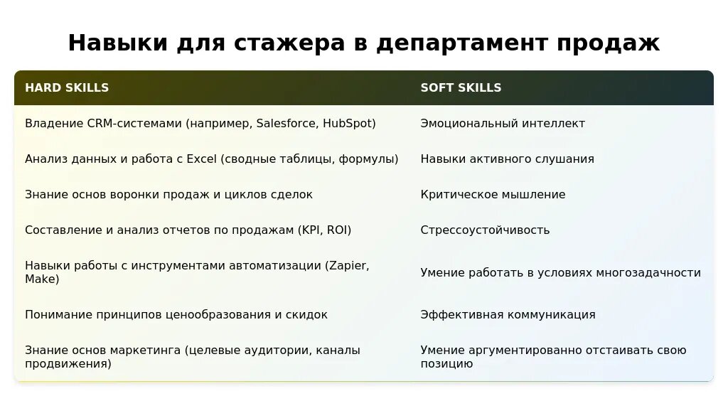 После адаптации: "Опыт работы в команде, знание основ продаж, умение анализировать данные."