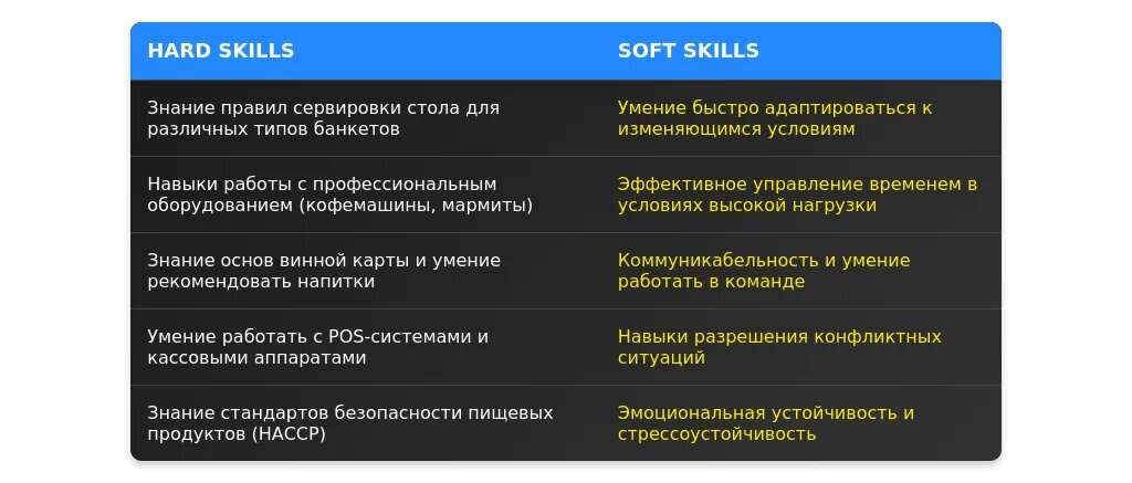 После адаптации: "Знание правил сервировки и обслуживания банкетов, работа с POS-системами, умение работать в команде и стрессоустойчивость".