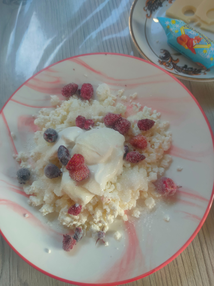Завтрак понедельника как всегда творог со сметаной и замороженными ягодами жимолости и земклуники.