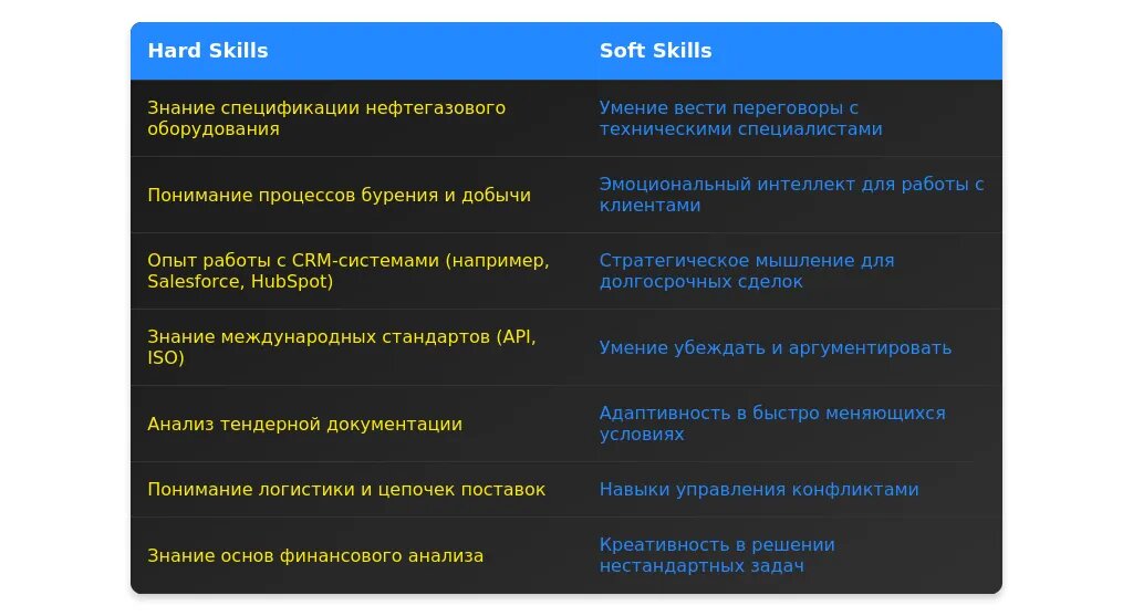 При анализе вакансии важно выделить ключевые требования, которые делятся на обязательные и желательные. Например, обязательные требования могут включать опыт работы в нефтегазовой отрасли, знание специфики оборудования и навыки ведения переговоров. Желательные требования могут включать наличие международного опыта, знание иностранных языков или опыт работы с CRM-системами.