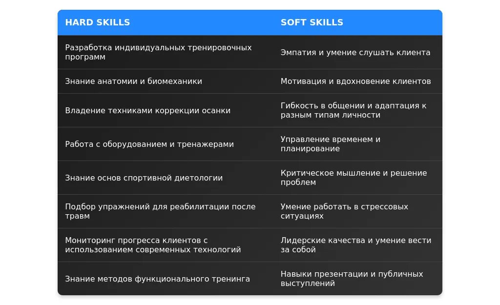 После адаптации: "Глубокое знание анатомии и физиологии, опыт составления индивидуальных тренировочных программ, работа с клиентами разного уровня подготовки."