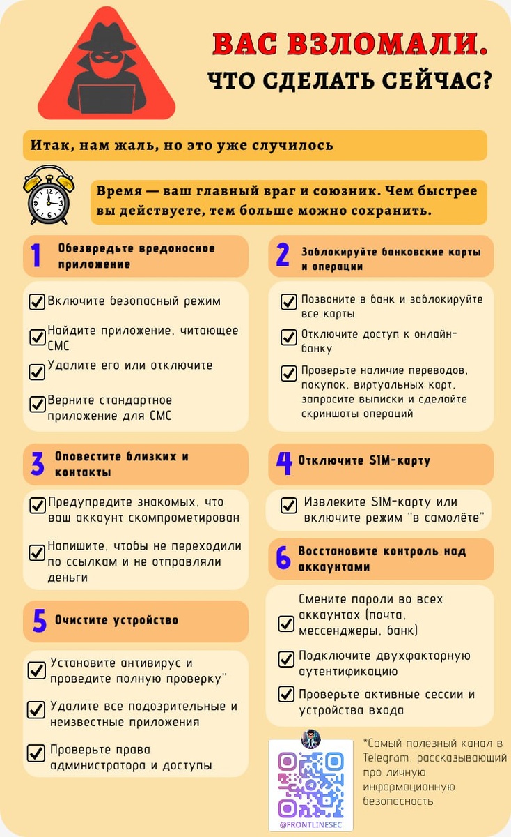 Представляем вам практическое руководство с экстренным чек-листом для тех, у кого взломали телефон через вредоносное приложение (.apk). Мы описали реальные шаги, которые помогут: 1. Быстро остановить атаку (заблокировать карты, SIM, удалить вирус), 2. Вернуть контроль над аккаунтами и данными, 3. Предотвратить дальнейшие атаки на вас и ваших близких, 4. Привлечь к ответственности мошенников. Наша цель — помочь минимизировать последствия взлома и дать конкретные действия "здесь и сейчас". Мы предлагаем помощь в восстановлении контроля и профилактике. ПОДРОБНАЯ МЕТОДИЧКА НИЖЕ👇👇👇 | Ваш личный безопасник | #Android #защита #аккаунт #взлом