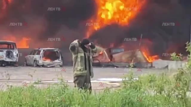 Пожарный поезд помогает тушить горящий завод «Пигмент» в Янино-1